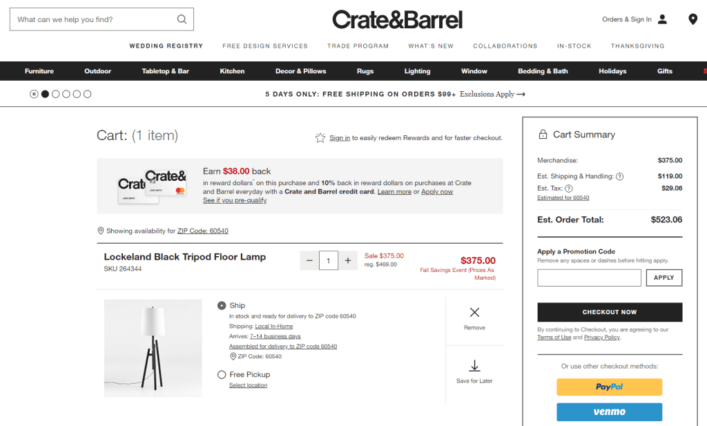 The checkout page of Crate&Barrel makes someone really want to use a promo code. But what if they don’t have one?